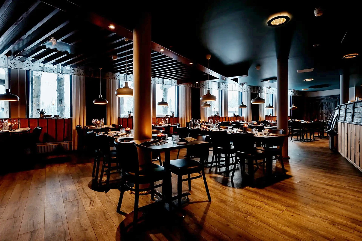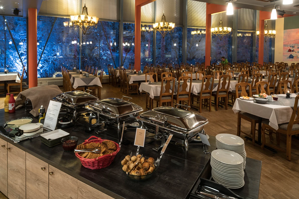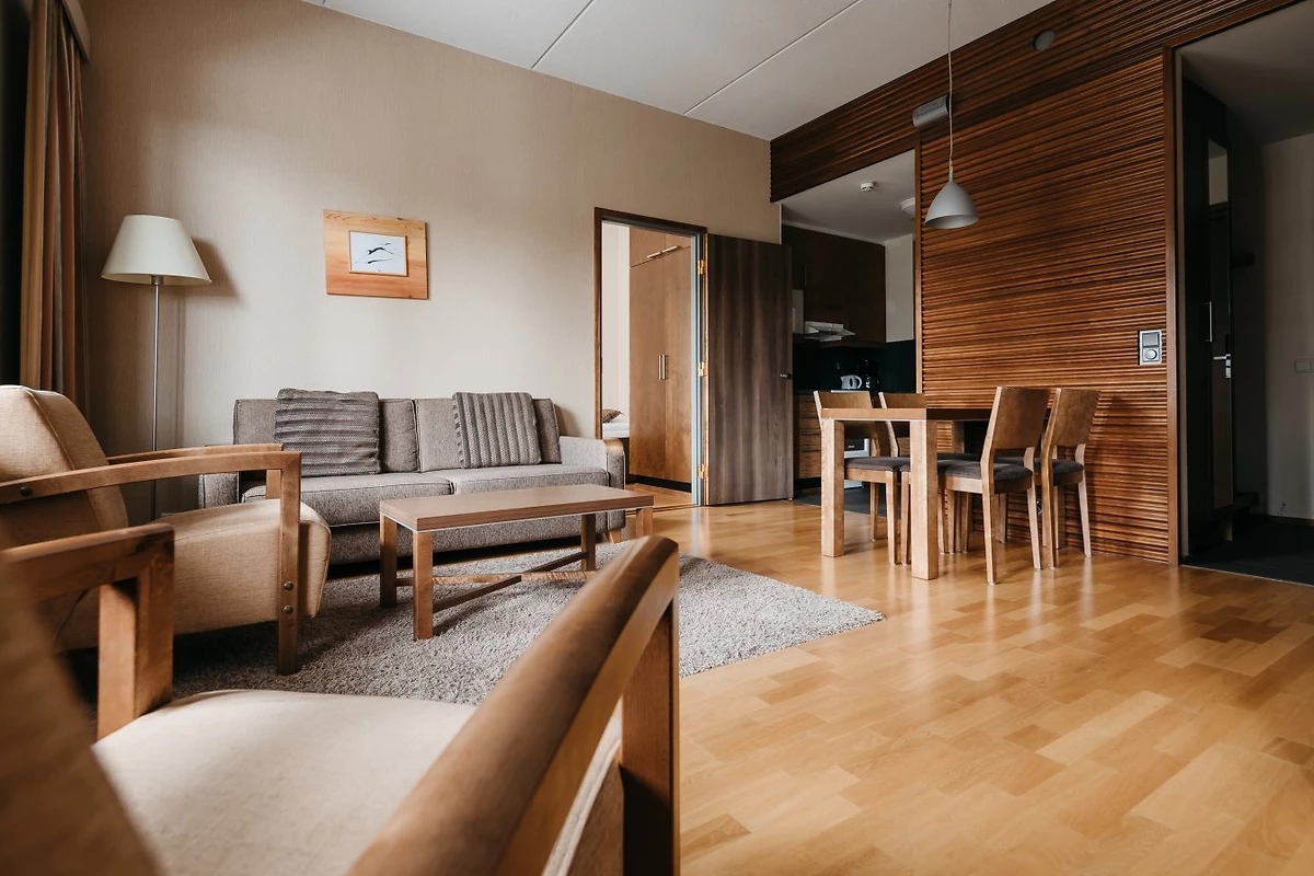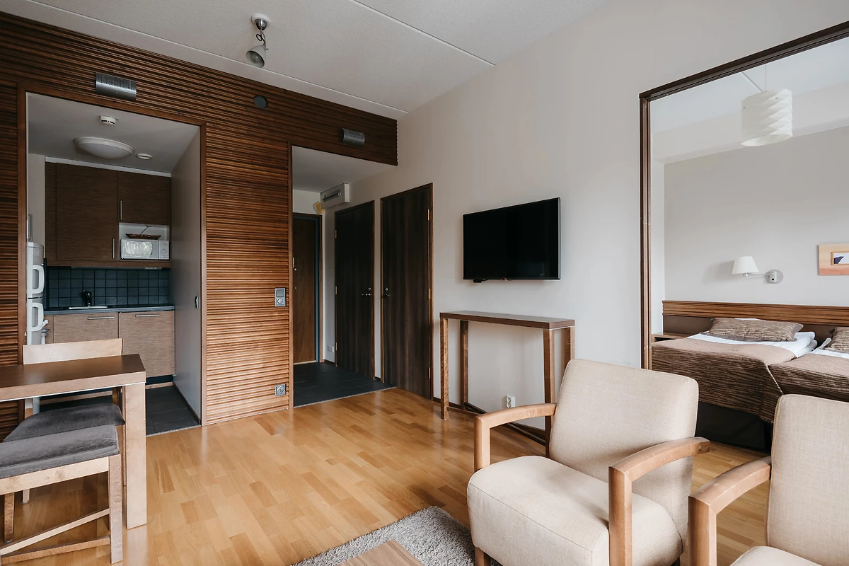 L’hôtel, au design typiquement finlandais, dispose de 98 chambres et 15 appartements, tous équipés d’un coin bureau, d’une télévision à écran plat et d’un nécessaire à café/thé, d’une salle de bains avec douche, d’un sèche-cheveux et d’une armoire séchante pour les équipements contre le froid. La réception et quelques chambres au rez-de-chaussée sont accessibles aux personnes à mobilité réduite.