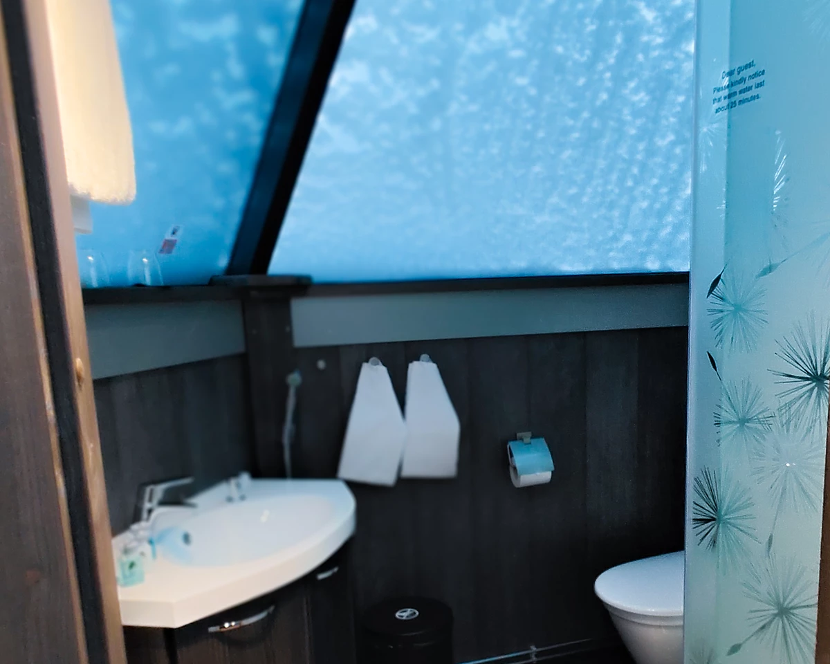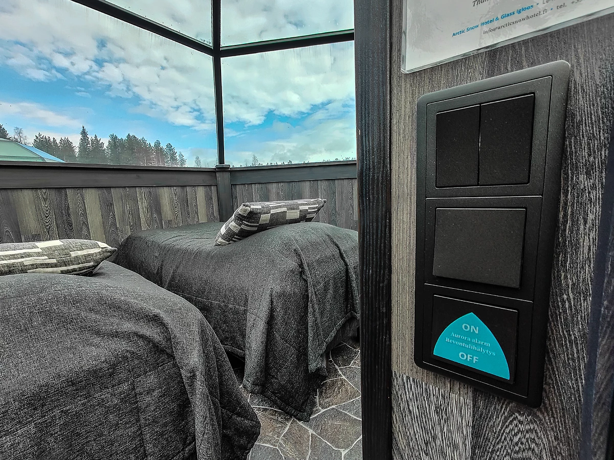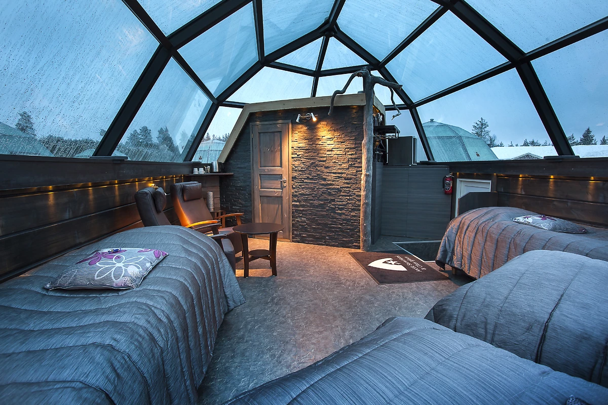 Loin des lumières de Rovaniemi, cet igloo bénéficie d’une vue totalement dégagée sur le ciel, tout en offrant un bon confort : isolation thermique, sol chauffé, lits jumeaux ajustables, salle de bains avec douche.