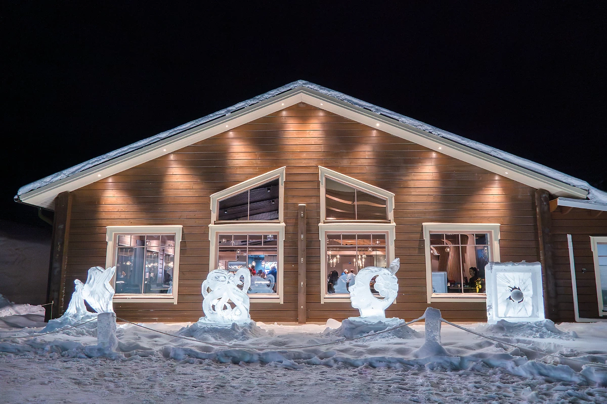 Petit déjeuner servi dans le bâtiment principal. Le restaurant Kota propose, pour le dîner, des délicatesses locales. Possibilité d’opter pour un dîner dans le restaurant de glace (avec supplément). L’hôtel de neige dispose de deux bars : le Ice Bar et le Sky Bar dont le toit de verre permet d’observer les aurores boréales !