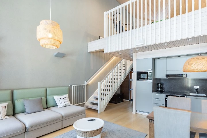 d’environ 82 m² pouvant accueillir jusqu’à 8 personnes, avec deux chambres séparées et des canapés-lits dans le salon et sur la mezzanine. 2 salles de bains dont 1 est équipée d’un sauna.